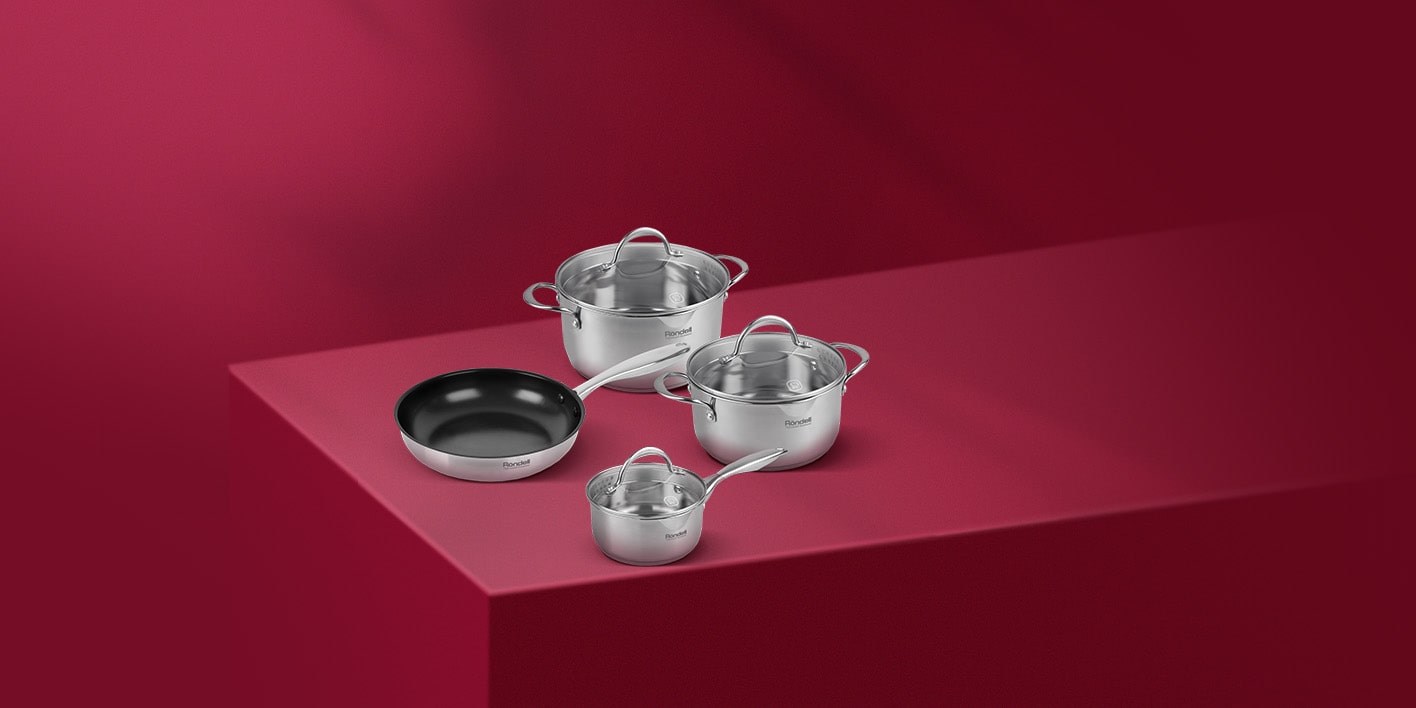 Для тех, кто недавно переехал или просто хочет обновить кухонный инвентарь, идеальным вариантом станет элегантный набор посуды из нержавеющей стали. В комплект входят кастрюли 20 см (2,6 л) и 24 см (4,7 л), ковш и сковорода диаметром 24 см с антипригарным покрытием. Крышки изготовлены из термостойкого стекла с двумя типами отверстий для слива жидкости. Такая посуда подходит для любых плит, включая индукционные, а тройное дно равномерно распределяет тепло и предотвращает пригорание. Силиконовые вставки на ручках делают использование безопасным, а мерные деления облегчают готовку.